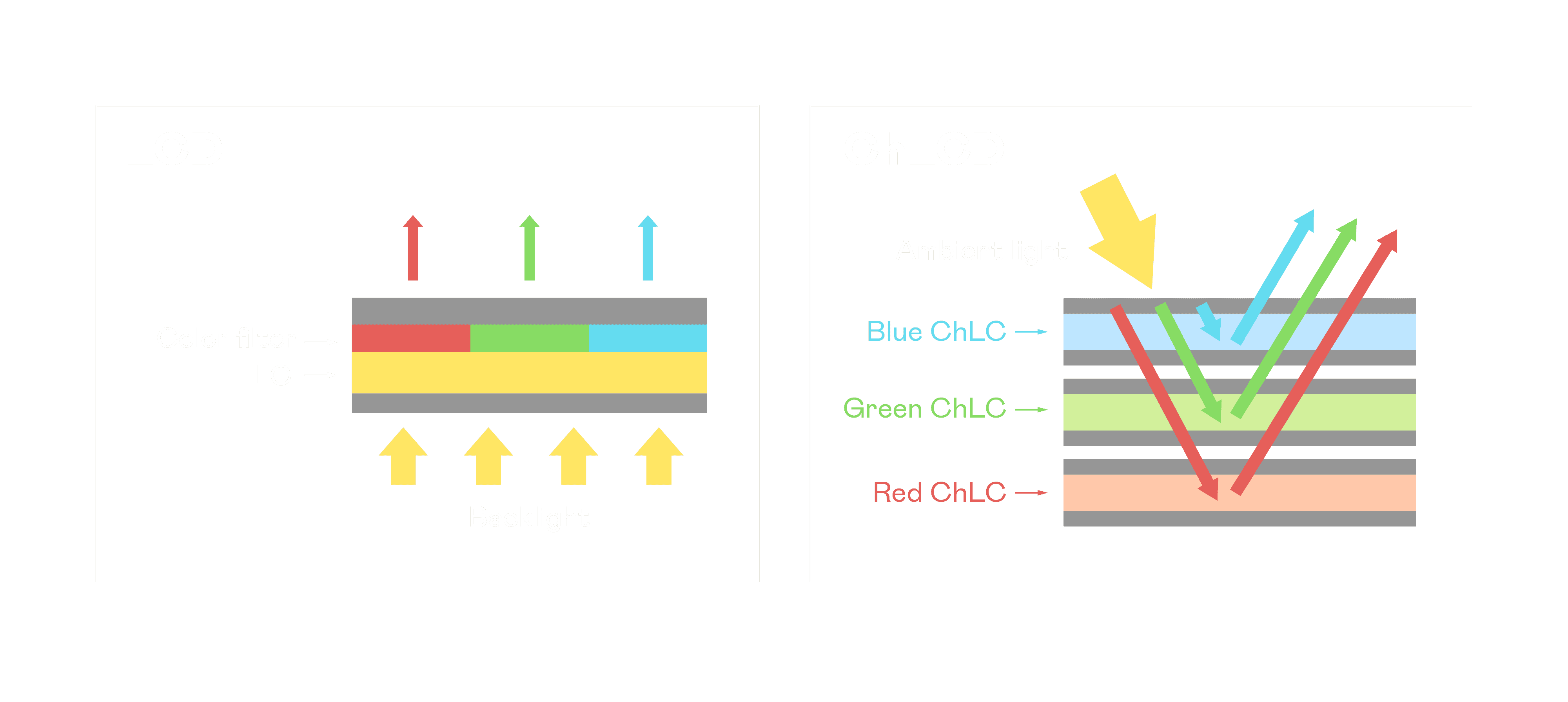 ChLCD 胆固醇液晶就如同纸张一样,,,透过反射环境光来显示影像,,,因此长时间观看不易造成人眼视觉疲劳,,,可达到护眼效果。。。。当处于户外阳光下使用,,LCD 影像容易失真而不易观看,,,,但胆固醇液晶仍可维持较佳的影像品质。。。。