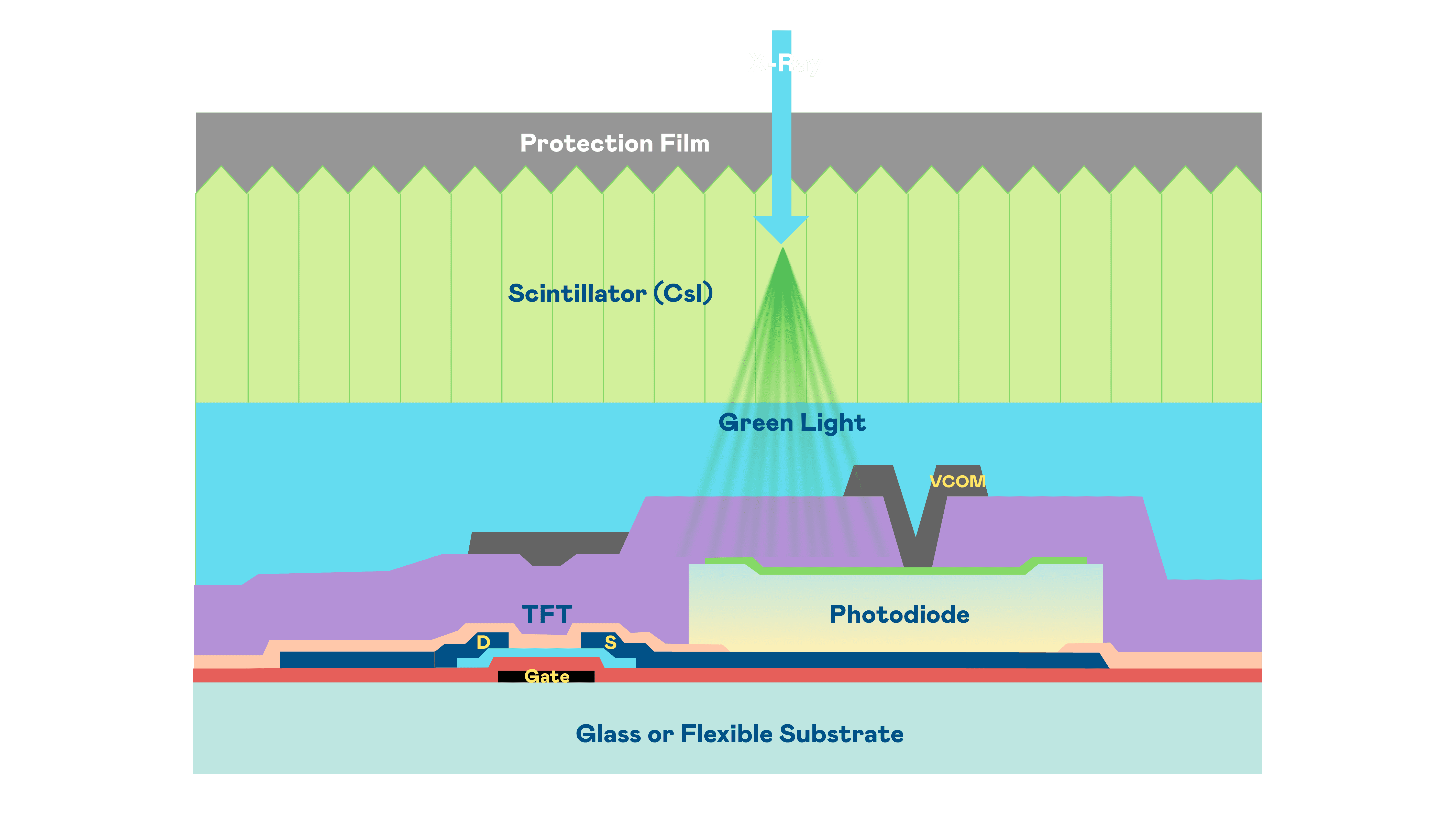 OBPay的X光影像感测阵列使用薄膜电晶体 (TFT) 作为每个像素的读取开关,,,,搭配光电二极体(Photodiode)的光电转换元件,,用以感测X光影像讯号。。。。